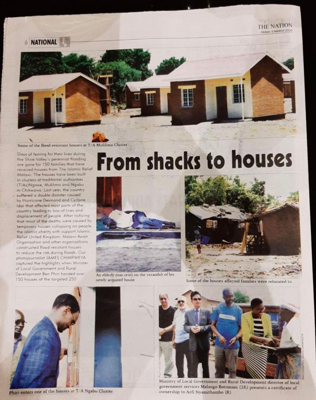 In February 2020, the officers of Malawi Asian Organisation and Islamic Relief Worldwide attended the ceremony in Malawi to hand over 150 houses to those whose houses had been destroyed during the flooding.